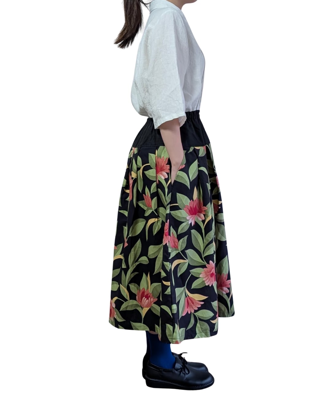 スカート黒花柄・黒リネン
