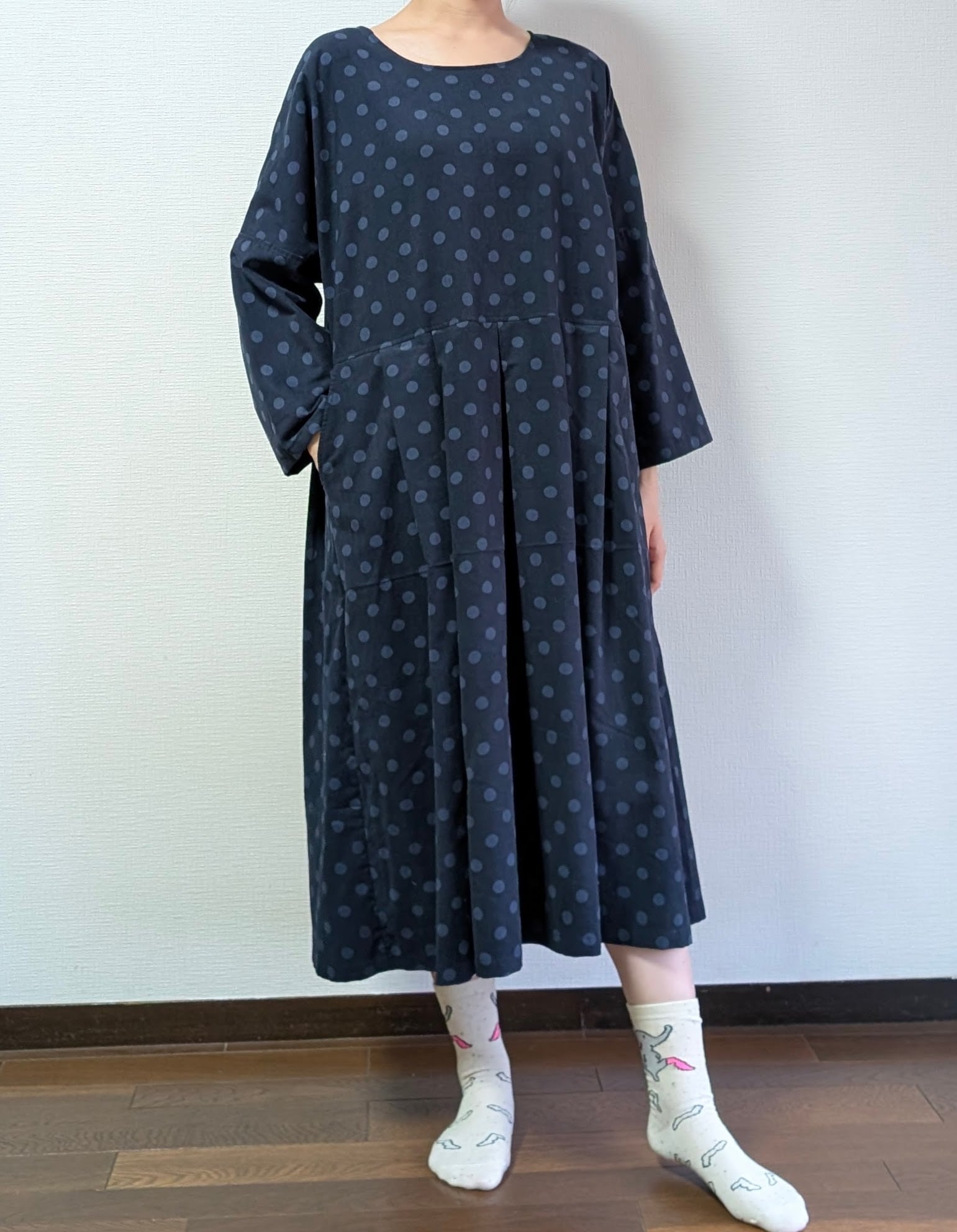 コーデュロイ紺色ドットのワンピースは、柔らかなコーデュロイ素材を使用しており、肌触りが滑らかであたたかいです。身幅は54cmと60cmの2サイズをご用意しており、ゆったりとしたシルエットが魅力です。ドット柄がさりげなく映え、日常のカジュアルなお出かけから、特別な日のコーディネートまで幅広く活躍するアイテムです。