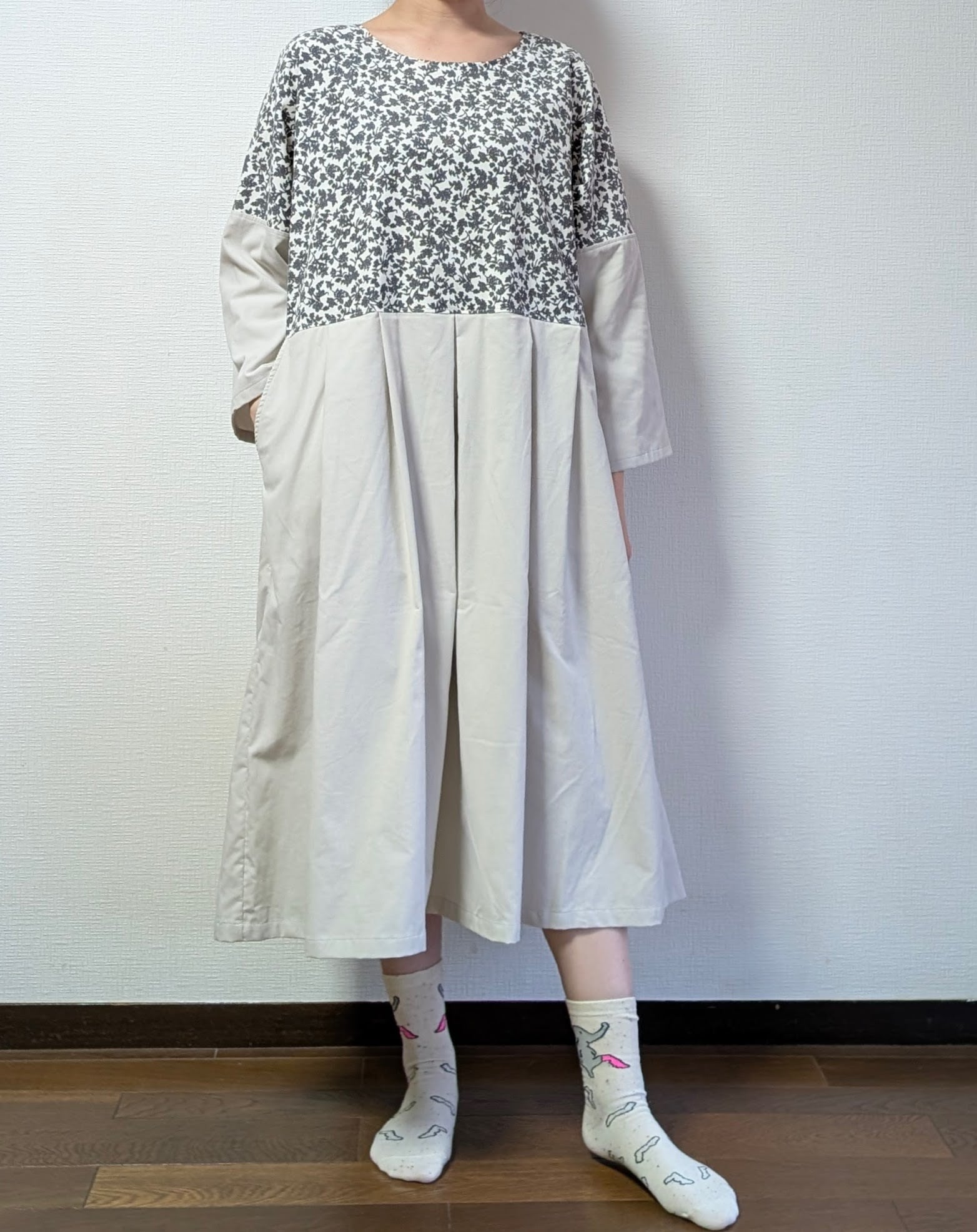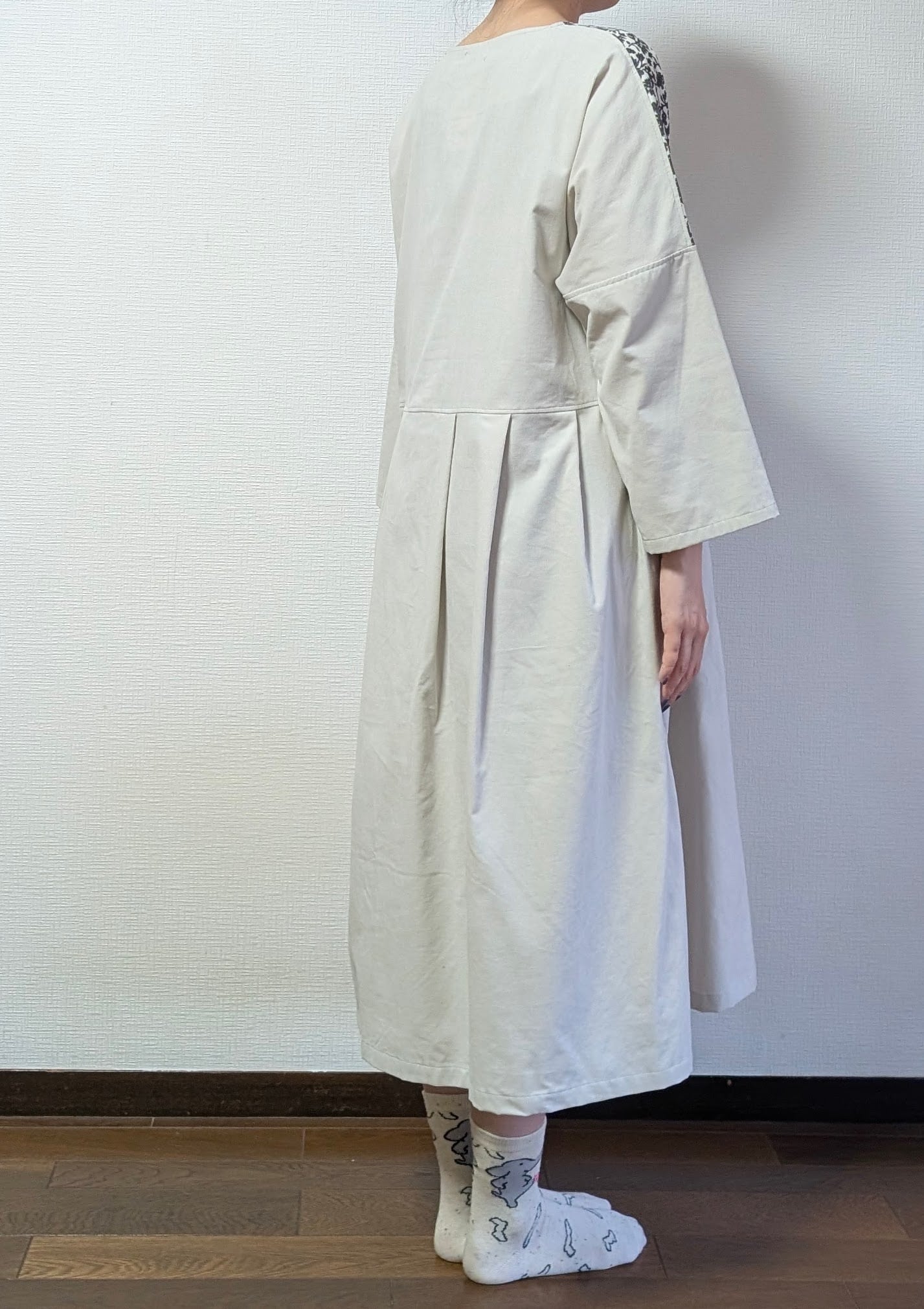 コーデュロイ小花白のワンピースは、オフホワイトの無地コーデュロイ素材を使用しており、肌触りが滑らかであたたかいです。ポケットも備えており、デイリー使いに便利なアイテムです。小花柄がさりげなく映えるデザインで、普段のお出かけからちょっとしたおしゃれなシーンまで幅広く活躍します。さらに、1点ものなので、他にはない特別感をお楽しみいただけます。