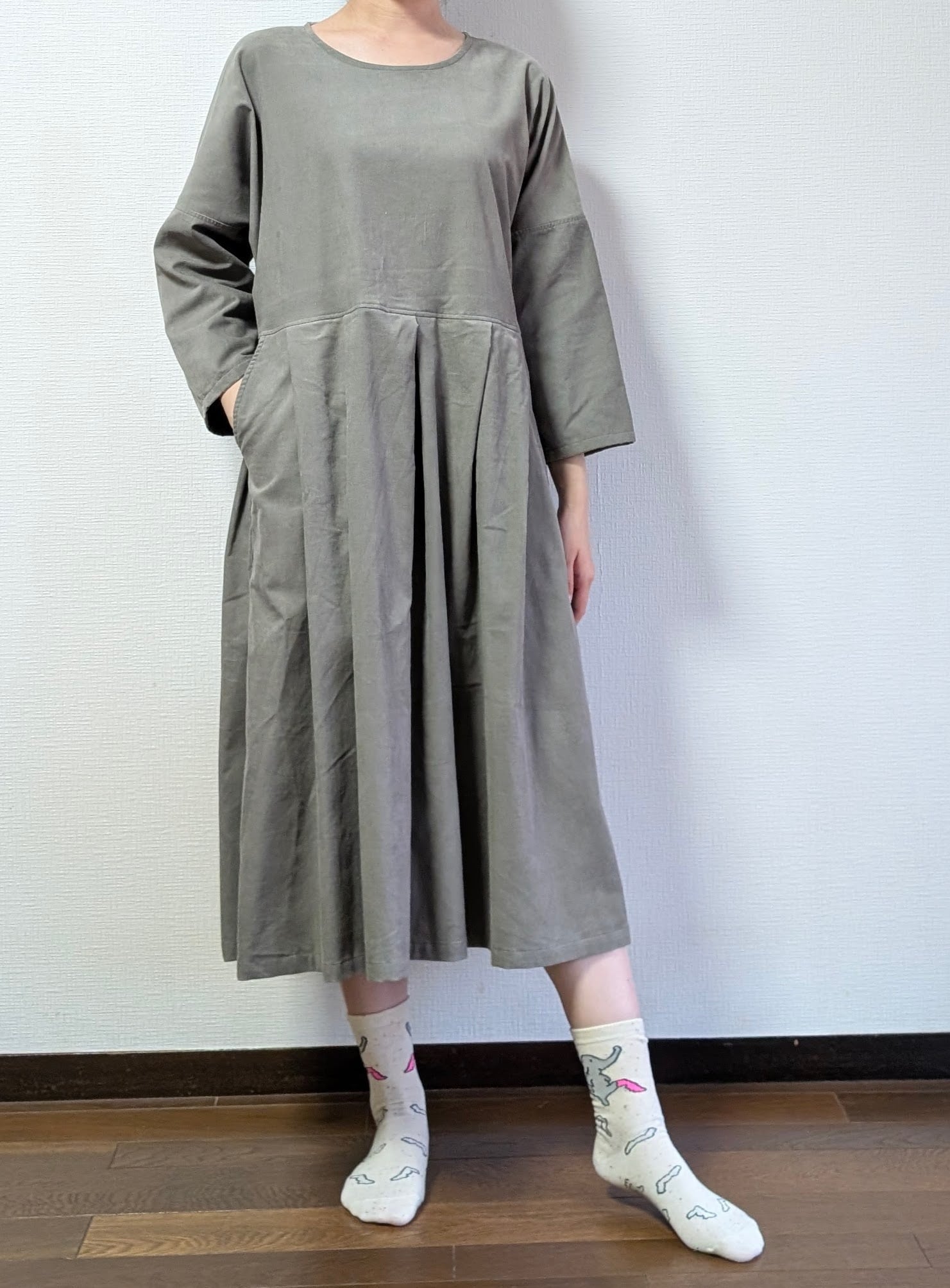 コーデュロイグレーのワンピースは、無地のコーデュロイ素材を使用しており、滑らかな肌触りとあたたかさを兼ね備えています。ポケットも付いており、日常使いに非常に便利なアイテムです。シンプルなデザインが、カジュアルなシーンから特別なお出かけまで幅広く活躍します。身幅は54cmのゆったりしたシルエットが魅力で、さまざまなコーディネートに合わせやすい一着です。