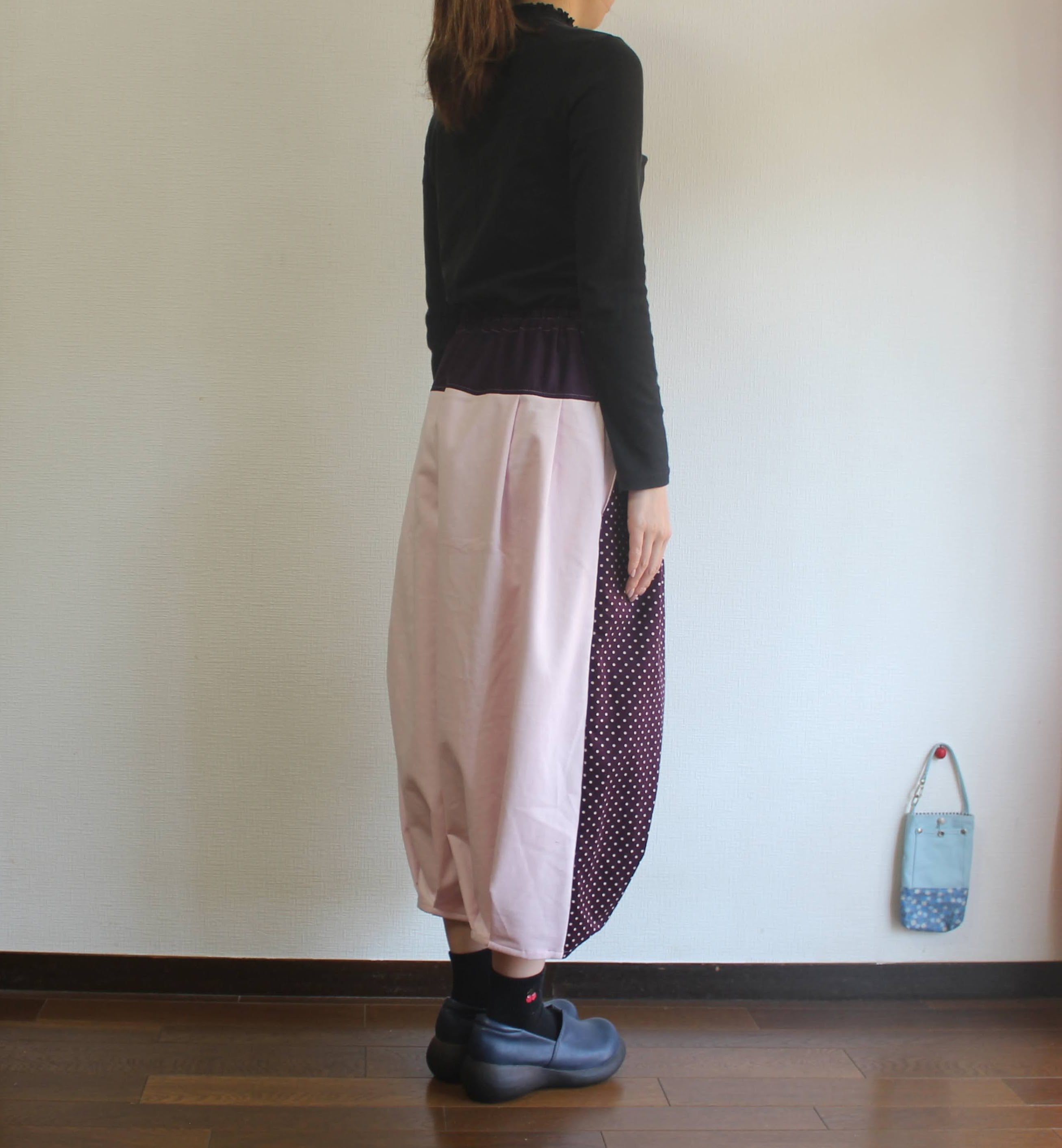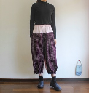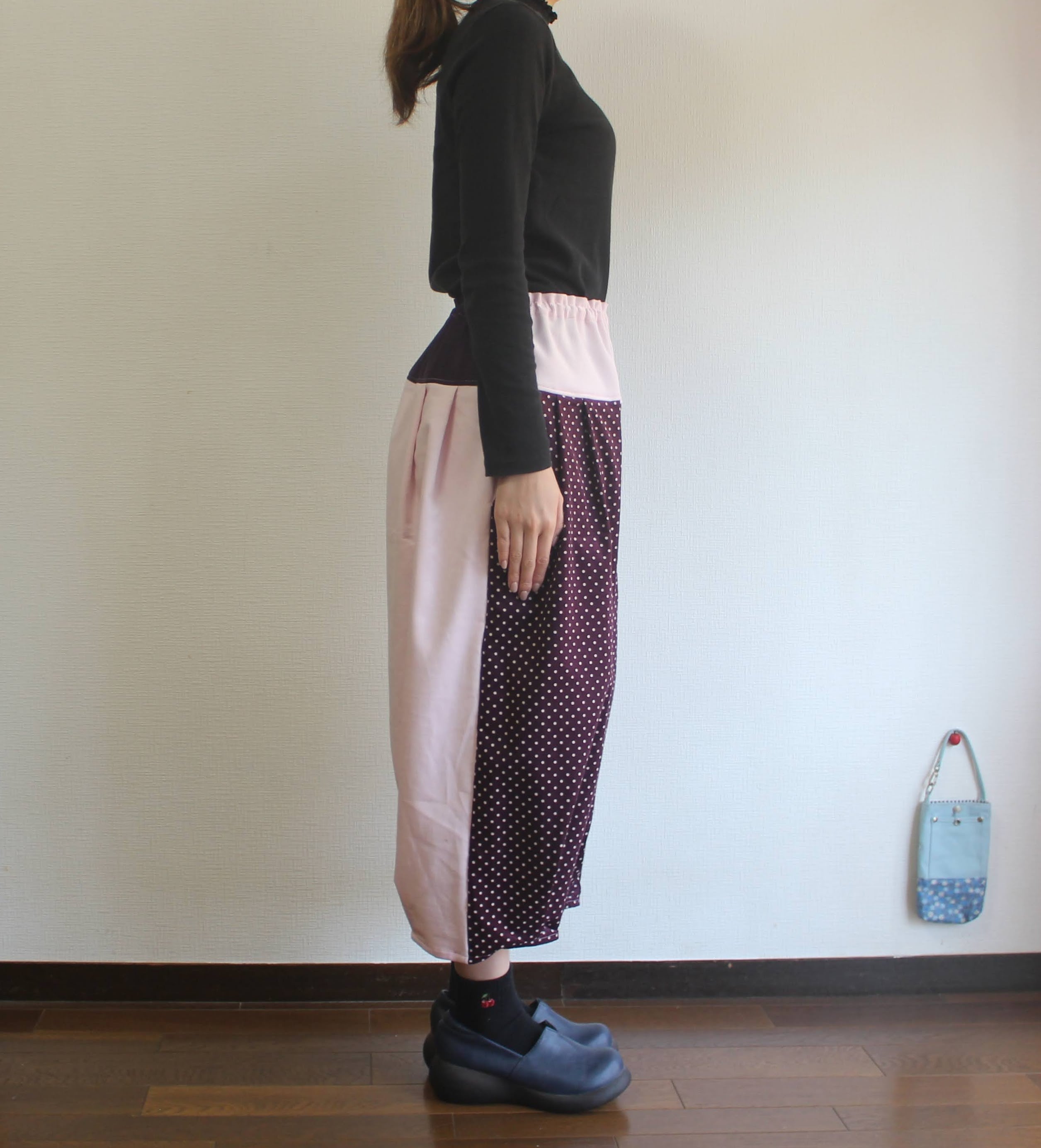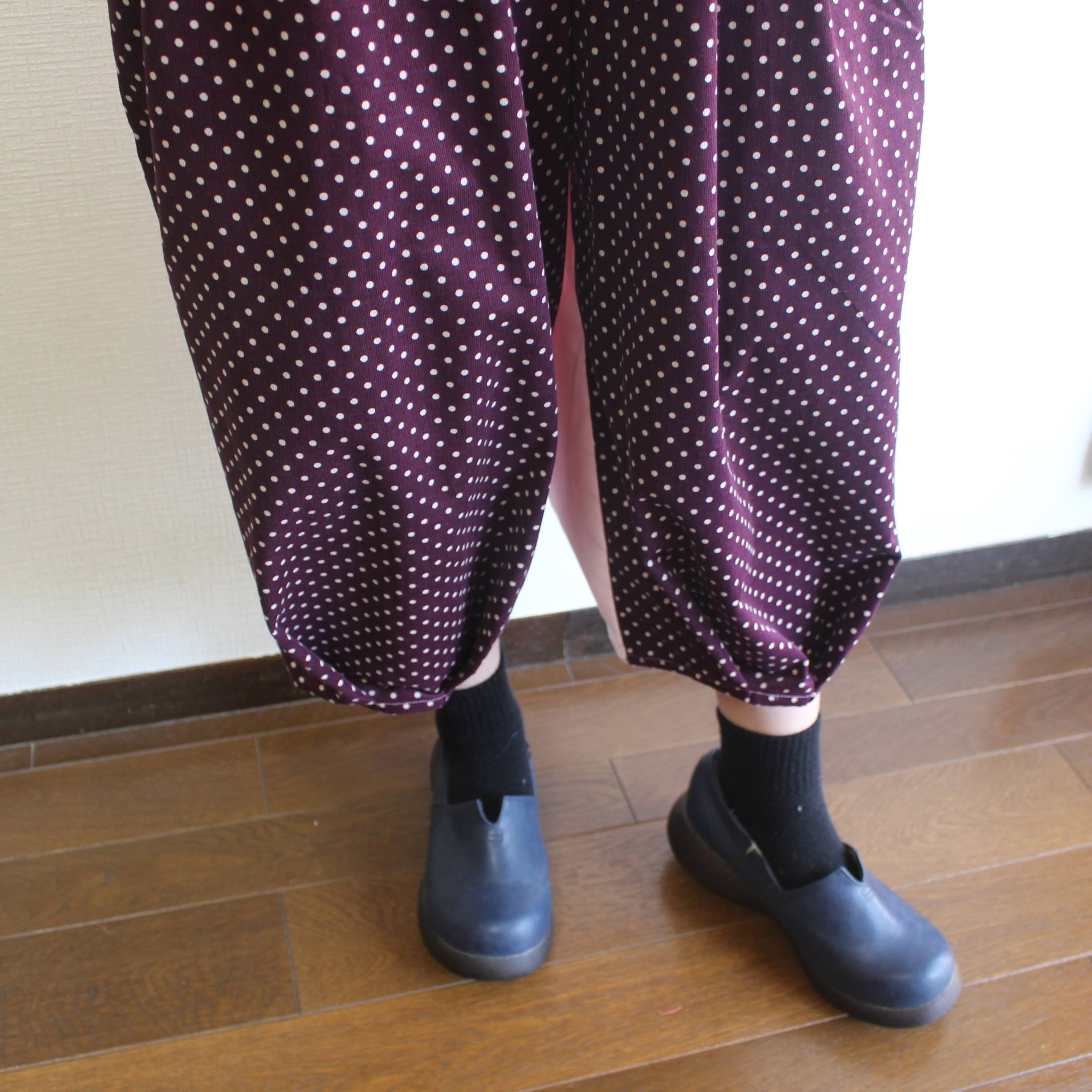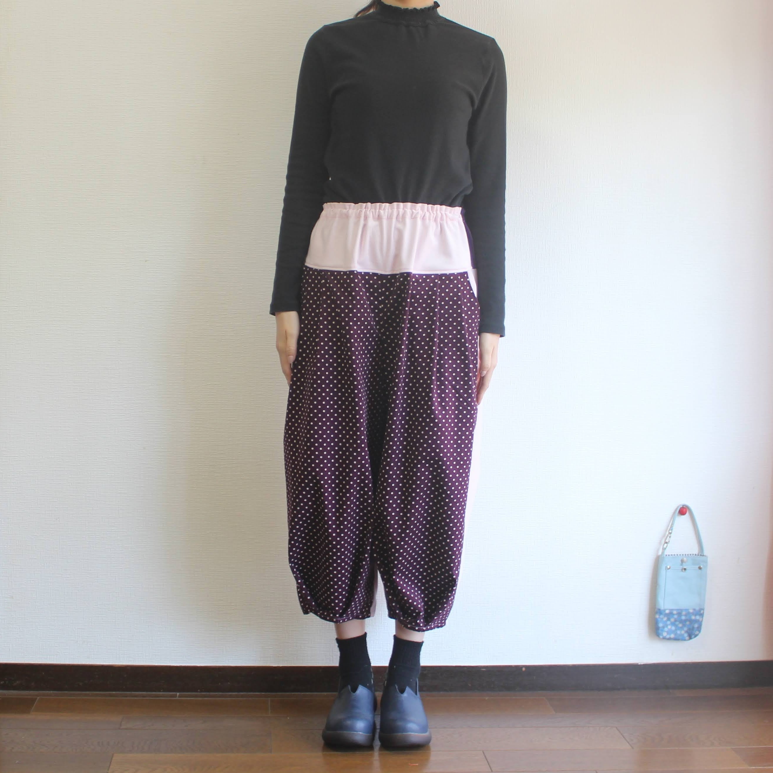 コーデュロイドットのタックキュロット 裾にタックの入ったキュロットスカート 紫ドット ピンク
